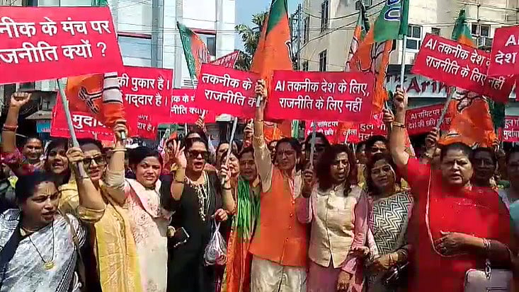 This is the second day when protests are being held in the state against Congress’s shirt-strip protest at AI Impact Summit in Delhi.